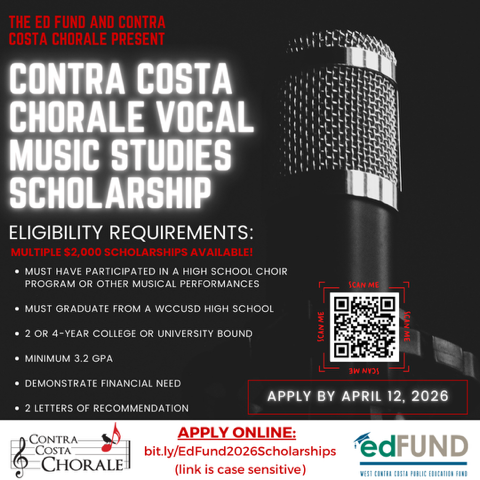 In 2020, the Contra Costa Chorale established a relationship with the West Contra Costa Public Education Fund (the Ed Fund) to provide scholarships to students who need assistance for studies, either at college or for some special program they wish to pursue while still attending high school. Currently, the emphasis is on college scholarships, which the Ed Fund has made available on behalf of the Chorale. Information on the current scholarship competition is below.